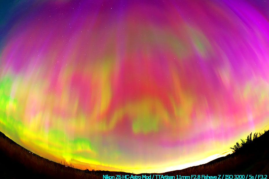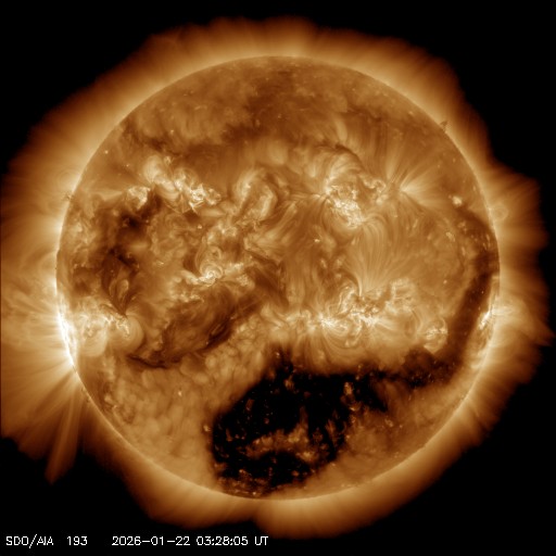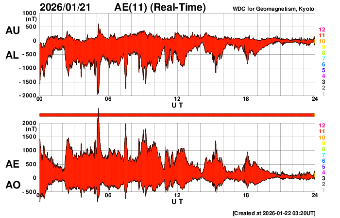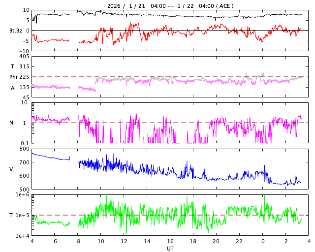 2026/ 1/22 12:39 更新 太陽風は550km/秒と高速の風が続いています。ニュージーランドのオーロラをどうぞ。 担当 篠原 ニュージーランドの米戸 実さんより、 現地20日〜21日夜の素晴らしいオーロラ写真をいただきました。 この夜は天気が悪くなるという状況だったので、 雲から離れるため、南島の南の端近くまで 200kmくらい移動しての撮影だったとのことです。 目的地に近づいた所で空いっぱいに雲が見えたので、だめかと思ったところ、 それはオーロラだったとのことです。 撮影地に到着してすぐに撮ったのが1枚めで、 現地は天文薄明が終わる1時間前だったそうです。 それにも関わらず、これだけのオーロラの光が見えていて、 過去一番の驚きだったそうです。 データを見ると、太陽風の速度は900km/秒台、 磁場が南向きに切り替わって4時間ほど経った頃で、 AE指数はこの前後の時間帯で 2000nTの枠を飛び出すような激しい変化が発生していました。 2枚めは空一杯に光が広がっています。 ちょうど、AE指数のグラフが大きく飛び出している頃の撮影です。 3枚めは磁場の南向きが小さくなって、AE指数の変化が少し下がった頃ですが、 オーロラの縦の構造がきれいに見えていて、 下から上にかけて、とてもカラフルな写真になっています。 米戸さんは、このまま朝まで撮影を続けたそうですが、 明るくなるとものすごい霧に囲まれたそうで、 帰り道の運転はとても大変だったそうです。 本当に素晴らしい写真をありがとうございます。 良いタイミングで太陽風の磁場が南向きになり、 晴天を求めて大移動を行った成果ですね。 太陽風は、昨日からの速度の低下が続いて、 750km/秒とかなり速い状態から、 現在は550km秒と普通の高速風程度に下がっています。 磁場強度は、7〜8nTと少し強まった状態です。 CME(コロナ質量放出)の乱れは通り過ぎて、 SDO衛星AIA193で見えているコロナホールに関係する 高速風に切り替わった頃かもしれません。 磁場の南北成分は、グラフの最初は南向きに強まっていましたが、 その後、0nT付近で小さく変化する程度になり、 磁気圏の活動は次第に落ち着いています。 AE指数は、グラフの前半は1000nTを超える大きい変化が続いていますが、 後半は800nTくらいの中規模の変化が発生する程度になっています。 SDO衛星AIA193の太陽コロナ写真を見ると、 コロナホールは、左端の領域が太陽の中心線くらいに達しています。 この領域の影響が通り過ぎると、太陽風は穏やかになりそうです。 太陽は、南東(左下)の4349黒点群で、 M3.4の中規模フレアやC7.0の小規模フレア。 南西(右下)の4341群でC8.6の小規模フレア、 隣の4345群でC7.6の小規模フレアなどが発生しています。
