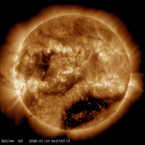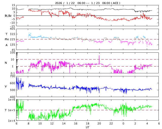 2026/ 1/23 14:05 更新 太陽風は520km/秒と高速の風が続いています。 担当 篠原 太陽風の速度は、520km/秒前後で推移しています。 高速の状態は続いています。 磁場強度は、9nTと少し強まった状態が続いていましたが、 グラフの最後で6nTに少し下がっています。 磁場の南北成分は、前半は北寄り、後半は南寄りに変わっています。 磁気圏の活動もこの影響で変化していて、 AE指数は、前半は変化がなく穏やかですが、 後半では、500〜1000nTの中規模の変化が発生しています。 SDO衛星AIA193では、 南半球のコロナホールは南西側(右下)に進んでいます。 この領域の影響は、もうしばらく続きそうです。 一方、東側(左側)の赤道付近に小さいコロナホールが見えています。 5日後くらいに弱い影響がやって来るかもしれません。 太陽は、南西の4345黒点群でC8.3、 中心部北東(左上)の4353群でC9.5などの 小規模フレアが発生しています。 可視光写真では、黒点が多く見えている印象です。
