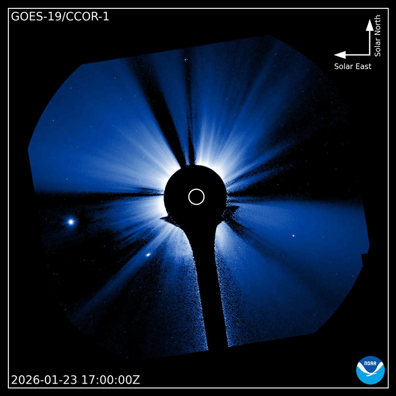 2026/ 1/25 13:17 更新 太陽風は高速の状態が続いています。磁気圏んはやや活動的です。 担当 篠原 太陽風は、500〜550km/秒と高速の状態が続いています。 磁場強度は、6〜7nTと平均的な値で推移しています。 磁場の南北成分は、 南寄りになったり北寄りになったりしています。 磁気圏の活動も、700nT前後の中規模の変化が発生したり、 変化がなくなったりと、強弱が切り替わっています。 SDO衛星AIA193では、 南半球のコロナホールは南西の端(右下)へ進んでいます。 影響は次第に弱まりそうです。 一方、中心部の北側(上側)に小さいコロナホールが見えています。 3日後くらいからこの領域の影響が到来しそうです。 太陽風速度の高まりはどの程度になるでしょうか。 昨日の早い時間帯になりますが、 24日3時(世界時23日18時)頃と、24日7時(世界時23日22時)頃に、 太陽の南東側(左下)へ飛び出すCME(コロナ質量放出)が発生しました。 SOHO衛星LASCO C、C3とGOES衛星CCOR-1の動画を掲載します。 GOES衛星SUVIカメラの動画を見ると、 1つめのCMEは太陽の向こう側で発生した様に思われます。 2つめは南東の端でプロミネンス噴出が発生していて、 GOES衛星SUVI 304の動画を掲載します。 太陽は、C2〜4の小規模フレアが数回発生した程度で、 穏やかな状態です。 ![]() 太陽の南東側で発生した2つのCME. (c) SOHO衛星LASCO C2、C3 (ESA & NASA)、(動画加工 : 宇宙天気ニュース) ![]() GOES衛星による同じCMEの動画。 (c) GOES衛星CCOR-1 (NOAA)、(動画加工 : 宇宙天気ニュース) ![]() 2つめのCMEの頃に発生したプロミネンス噴出。 (c) GOES衛星SUVI 304 (NOAA)、(動画加工 : 宇宙天気ニュース) ![]() SDO衛星のAIA193カメラによる太陽コロナの様子 (c) SDO (NASA) ![]() SDO衛星による太陽の可視光写真。マウスの矢印を写真に重ねると、黒点番号付きの写真に切り替わります。 (c) SDO (NASA) ![]() ACEが観測した太陽風の磁場(黒線は全体の強度、赤線は南北成分) 磁場の向き、プラズマの密度、速度、温度 (c) データ:NOAA/SWPC、作図:宇宙天気ニュース ![]() AE指数(速報値) 下段のAEグラフの値が高くなると、オーロラ活動が活発化しています。 (c) 京都大学WDC ![]() ![]() 27日の太陽周期に合わせた図 太陽が同じ面を地球に向けていた27日前の変化から、今後を予想することができます。 (c) 作図:宇宙天気ニュース