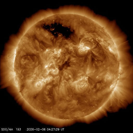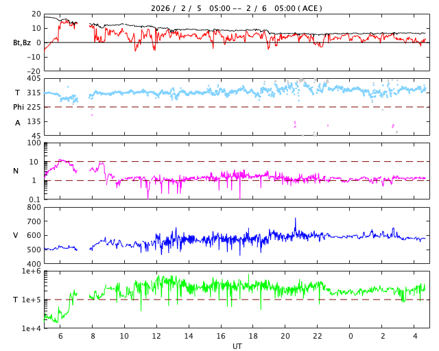 2026/ 2/ 6 13:59 更新 太陽風の速度は600km/秒に高まりました。太陽の向こう側でCMEが発生しています。 担当 篠原 太陽風の速度は、昨日のニュースの後も高まり続け、 500km/秒の状態から、今朝には600km/秒へ高まっています。 現在は少し下がって580km/秒ですが、高速の風が続いています。 これだけしっかりと高まると、CME(コロナ質量放出)というよりも、 コロナホールの様な高速風の吹き出し口が関係している様に思います。 太陽風の磁場強度は、15nTと強まった状態から、 現在は6〜7nTと平均的な値に下がっています。 磁場の南北成分は、 昨日のニュースのすぐ後に北向きに切り替わっていて、 磁気圏活動の強まりはあまり長く続きませんでした。 以降は北寄りの状態で、磁気圏は穏やかになっています。 AE指数は、初めのところに活動の強まりが発生していますが、 その後は変化が小さくなっています。 SDO衛星AIA193では、 北半球の高緯度側にコロナホールが見えています。 緯度が高いですが、影響はどうなるでしょうか。 太陽の向こう側で、ある程度規模の大きい活動が発生した様で、 今朝、6日8時(世界時5日23時)頃に、 太陽の左上に大きく広がるCMEが発生しています。 SOHO衛星LASCO C2、GOES衛星CCOR-1の動画を掲載します。 太陽の北西(右上)の4366黒点群は、 M1〜2の中規模フレアが7回ほど発生しています。 活発な状態は続いていますが、フレアの規模は小さくなっています。 また、南西(右下)の4362群の活動が強まっていて、 昨夜から、C6.0、M1.8、M2.2と、 小規模、中規模のフレアを起こす様になっています。