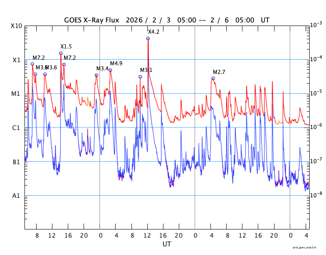 GOES衛星の太陽X線強度。赤・橙 = 0.1〜0.8 nm、青・紫 = 0.05〜0.4 nm (c) データ:NOAA/SWPC、作図:宇宙天気ニュース ![]() | ||||||||||||||||||||||||||||||||||||||||||||||||||||||||||||||||||||||||||||||||||||||||||||||||||||||||||||||||||||||||||||||||||||||||||||||||||||||||||||||||||||||||||||||||||||||||||||||||||||||||||||||||||||||||||||||||||||||||||||||||||||||||||||||||||||||||||||||||||||||||||||||||||||||||||||||||||||||||||||||||||||||||||||||||||||||||||||||||||||||||