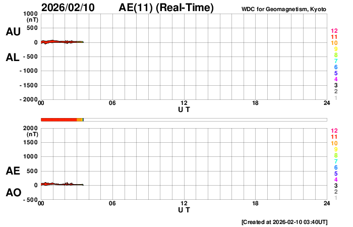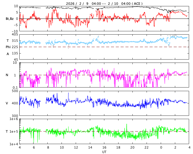 2026/ 2/10 12:51 更新 太陽風は平均的な状態で、磁気圏も穏やかです。 担当 篠原 太陽風は、400km/秒と平均的な速度が続いています。 磁場強度は、9nTに少し強まっていましたが、 グラフの最後で6nTに下がり、平均的な値に戻っています。 磁場の南北成分は、0nT付近で変化しています。 磁気圏は穏やかで、AE指数は小さい変化が時々発生する程度です。 SDO衛星AIA193では、 北西側(右上)のコロナホールは太陽の端に近づいていて、 影響は特に見られないままになりそうです。 一方、南東の端(左下)に縦に伸びるコロナホールが見えています。 この領域は、27日前の前周期とは位置や広がりがだいぶ変わっています。 現在の広がりはどのようになっているでしょうか。 太陽は、今朝、10日8時(9日23時)に、 北東の端(左上)の4374黒点群で、 C9.2と大きい小規模フレアが発生しました。 目立った変化はこのくらいで、全体としては穏やかな状態です。