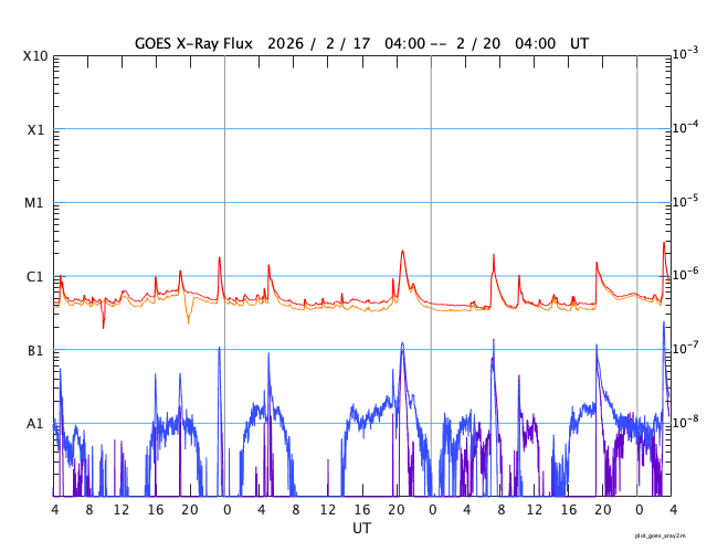 GOES衛星の太陽X線強度。赤・橙 = 0.1〜0.8 nm、青・紫 = 0.05〜0.4 nm