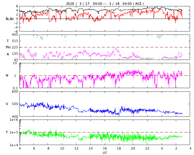 2026/ 3/18 12:08 更新 高速太陽風が終わって、速度は420km/秒に下がっています。磁気圏は穏やかです。 担当 篠原 太陽風の速度は、500km/秒から420km/秒へ下がり、 平均的な速度に戻っています。 磁場強度は、4nT前後と平均的な状態で推移しています。 磁場の南北成分は、弱い北寄りになっています。 磁気圏は穏やかで、AE指数はほとんど変化がなくなっています。 GOES衛星SUVI 195を見ると、 中心部の南側でコロナホールが東西に伸びています。 太陽風の速度は下がりましたが、 この領域の影響で再び高まる可能性があります。 また、北東側(左上)にもコロナホールが見えていて、 5日後くらいからこちらの影響が始まりそうです。 そして、昨日のニュースで紹介した、 16日夜に発生したCME(コロナ質量放出)による 太陽風の乱れが明日くらいに到来しそうです。 磁場の強まりがやって来て、 南向きに大きく変化すると磁気圏の活動は強まります。 どの様な乱れがやって来るか、注目して下さい。 太陽は、中心部南側の4392黒点群で、 M1.3の中規模フレアとC3.9の小規模フレアが発生しています。 特に活発という様子ではありません。