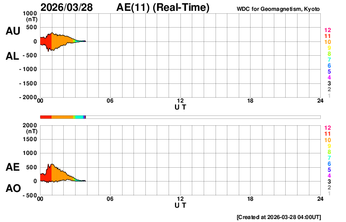 2026/ 3/28 13:15 更新 太陽風はやや低速になっています。M1.3に達する中規模フレアが発生しています。 担当 篠原 太陽風の速度は、450km/秒から380km/秒に下がり、 やや低速になっています。 磁場強度は、4nT前後で推移しています。 磁場の南北成分は、 グラフの中盤から -4nT程度の南寄りの変化が続いています。 磁気圏の活動はやや強まった状態で、 AE指数は、500nT程度の変化が半日ほど続いています。 GOS衛星SUVI 195の太陽コロナ写真では、 北半球のコロナホールは北西(右上)に進んでいます。 この後、太陽風への影響は見られるでしょうか。 南極付近のコロナホールは、 地球に対しては横向きなので影響はないと考えると、 次の影響は、南東側(左下)に見えてきたコロナホールになりそうです。 太陽は、X線グラフの最後で、 Mクラスに達する中規模フレアが発生しています。 現時点では、M1.3に達している様です。 現象の途中ですがGOES衛星SUVI 131の動画を掲載します。 発生場所は、南東の4405黒点群です。 動画の様子から、 CME(コロナ質量放出)も発生しているかもしれません。