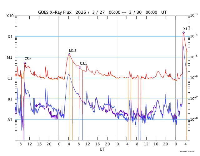 2026/ 3/30 14:01 更新 X1.4の大規模フレアが発生しました。ニュージーランドのオーロラをどうぞ。 担当 篠原 ニュージーランド南島クィーンズタウンの米戸 実さんより、 21日と22日夜に撮影されたオーロラの写真をいただきました。 前日の20日から太陽風が強まり始めていて、 1枚目の写真の頃には、速度は500km/秒近くに高まり、 磁場強度は30nTとかなり大きくなっていました。 磁気圏の活動も強まって、Dst指数は -70nT程度まで変化しました。 下層から上空にかけて光のグラデーションが広がり、 オーロラの縦の厚みを強く感じさせてくれます。 その上空には、南天の天の川が美しく輝いています。 横に傾いて南十字も写っています。 そして、湖面の輝きが本当に見事です。 2枚目は翌日で、太陽風の速度は600km/秒に高まり、 磁場強度は10nTに下がりましたが、南向きの状態が続き、 AE指数が1500nTを超えて激しく変化していた頃です。 何本も縦に伸びる光の筋が印象的です。 オーロラの写真は続きがあります。明日、掲載します。 太陽で、X1.4の大規模フレアが発生しました。 発生時刻は、30日12時(世界時30日3時)。 場所は、南東(左下)の4405黒点群です。 GOES衛星SUVI 131の動画を掲載します。 この規模のフレアの発生は、 2月4日のX4.2以来で、およそ2か月ぶりです。 このフレアに伴って、CME(コロナ質量放出)が発生しています。 SOHO衛星LASCO C2と、 太陽を地球よりも右斜めから観測しているSTEREO Ahead衛星COR2 の動画を掲載します。 フレアの発生から時間があまり経っていないので、 噴出の最初の頃の画像しかなく、 CMEの広がり方ははっきりとはわかりません。 フレアの発生位置から考えると、 太陽風の乱れは地球にやってくるのではないでしょうか。 発生から2日程度かかると考えると、明後日、4月2日の昼頃でしょうか。 注目して下さい。 太陽風は、昨日は350km/秒と低速だったのですが、 昨夜くらいから上昇が始まって、 現在は470km/秒と高速風に近い速さまで高まっています。 磁場強度は、7nTから13nTへ強まり、 現在は8nTに下がっています。 磁場の南北成分は、0nT付近から北寄りになり、 現在は0nT付近に戻っています。 現在の磁気圏は穏やかで、 AE指数は、前半に小規模の変化が起きていますが、 後半は変化が見られなくなっています。 GOES衛星SUVI 195では、 赤道域のコロナホールが、太陽の中心線に達しています。 この領域の影響とCMEの乱れが重なるように到来するかもしれません。 ![]() ニュージーランド南島クィーンズタウンで、現地21日22時43分(世界時21日9時43分)に撮影されたオーロラ。 (c) 米戸 実氏 ![]() ニュージーランド南島クィーンズタウンで、現地22日23時26分(世界時22日10時26分)に撮影されたオーロラ。 (c) 米戸 実氏 ![]() 4405黒点群で発生した、X1.4の大規模フレア。 (c) GOES衛星SUVI 131 (NOAA)、(動画加工 : 宇宙天気ニュース) ![]() 太陽の左下へ広がるCME。 (c) SOHO衛星LASCO C2 (ESA & NASA)、(動画加工 : 宇宙天気ニュース) ![]() 太陽を地球よりも右斜めから観測しているSTEREO Ahead衛星によるCME。 (c) STEREO Ahead衛星COR2 (NASA)、(動画加工 : 宇宙天気ニュース) ![]() GOES衛星のSUVI 195カメラによる太陽コロナの様子 (c) NOAA/SWPC ![]() SDO衛星による太陽の可視光写真(SOHO衛星の画像ページより取得)。 マウスの矢印を写真に重ねると、黒点番号付きの写真に切り替わります。 (c) SDO (NASA) ![]() GOES衛星の太陽X線強度。赤・橙 = 0.1〜0.8 nm、青・紫 = 0.05〜0.4 nm (c) データ:NOAA/SWPC、作図:宇宙天気ニュース ![]() ACEが観測した太陽風の磁場(黒線は全体の強度、赤線は南北成分) 磁場の向き、プラズマの密度、速度、温度 (c) データ:NOAA/SWPC、作図:宇宙天気ニュース ![]() AE指数(速報値) 下段のAEグラフの値が高くなると、オーロラ活動が活発化しています。 (c) 京都大学WDC ![]() ![]() 27日の太陽周期に合わせた図 太陽が同じ面を地球に向けていた27日前の変化から、今後を予想することができます。 (c) 作図:宇宙天気ニュース