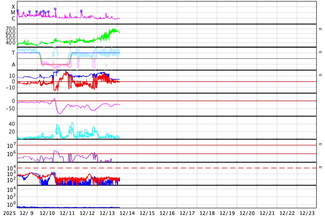- 2025/12/10 13:22 太陽風は低速で、磁気圏は穏やかです。フレアの発生が続いています。