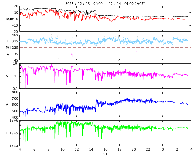 - 2025/12/13 12:25 太陽風の速度が500km/秒に高まっています。太陽は穏やかになりそうです。