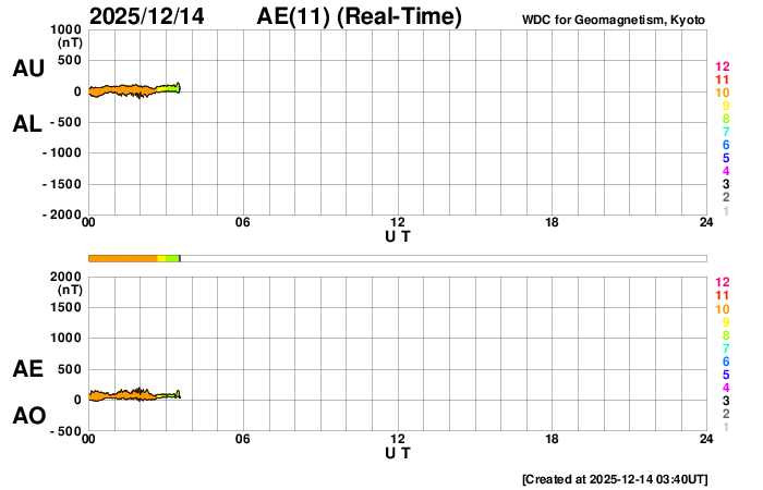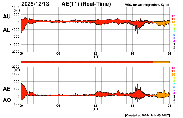 下段のAEグラフの値が高くなると、オーロラ活動が活発化しています。