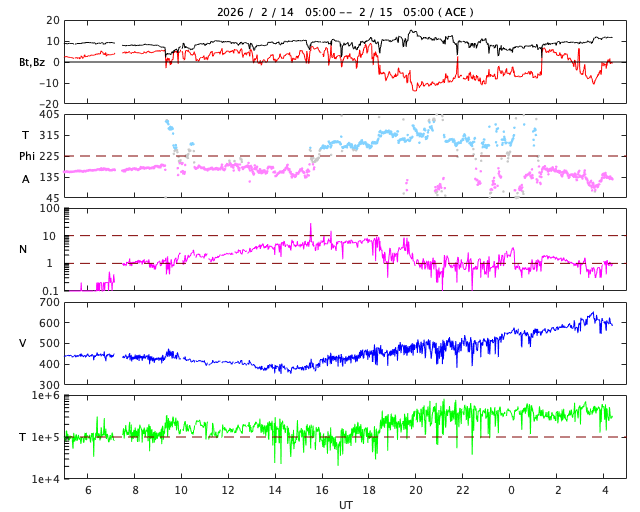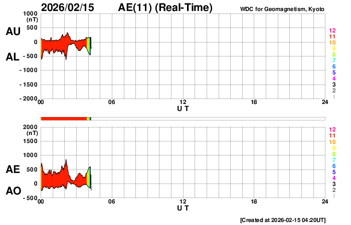 - 2026/ 2/14 14:16 太陽風磁場が南寄りになって、磁気圏活動が度々発生しています。